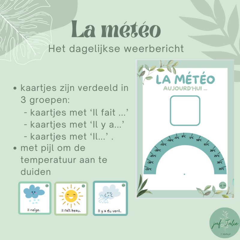 Het weer in het Frans. Met dit document kan je dagelijks het weer bespreken, zelfs als de leerlingen nog geen Frans kunnen, zijn de afbeeldingen duidelijk genoeg.