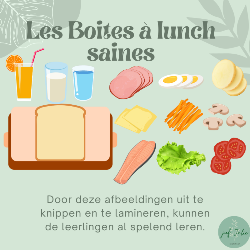 Bij de methode van Zoufff! leren de leerlingen hun brooddoos voor te stellen in het Frans. Ze leren een gezonde lunch te beschrijven en moeten hier een mondelinge toets van doen. Om de leerlingen dit op een spelende manier te laten inoefenen, printte ik een paar afbeeldingen af zodat ze een brooddoos met afbeeldingen konden na bouwen.