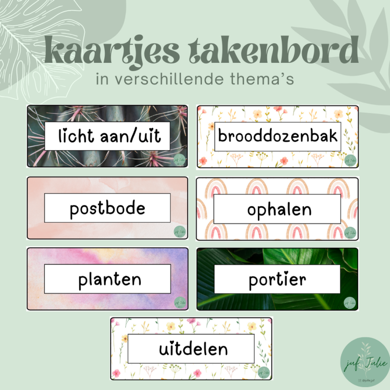 Kaartjes om verschillende taakjes in de klas te verdelen. In zeven verschillende thema's: cactus, bloemen (oranje), roos, regenboog, kleurrijk, planten en bloemen (meerkleurig).